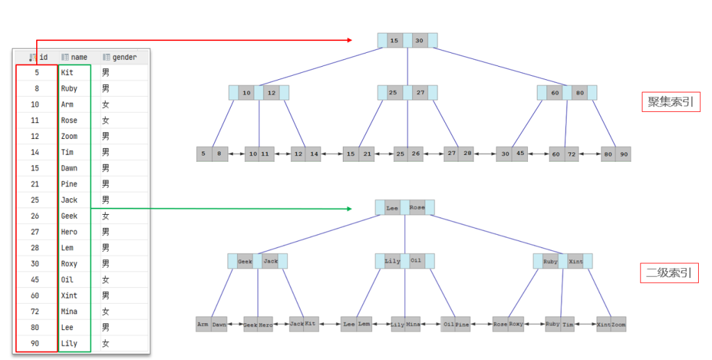 什么是聚集索引,什么是二级索引(非聚集索引)什么是回表? xiaojiuaigc@163.com 发布于 2024-11-09 455 次阅读 分类含义特点聚集索引(Clustered Index)将数据存储与索引放到了一块,索引结构的叶子节点保存了行数据必须有,而且只有一个二级索引(Secondary Index)将数据与索引分开存储,索引结构的叶子节点关联的是对应的主键可以存在多个聚集索引选取规则:如果存在主键,主键索引就是聚集索引。如果不存在主键,将使用第一个唯一(UNIQUE)索引作为聚集索引。如果表没有主键,或没有合适的唯一索引,则InnoDB会自动生成一个rowid作为隐藏的聚集索引 什么是聚簇索引什么是非聚簇索引聚簇索引(聚集索引):数据与索引放到一块,B+树的叶子节点保存了整行数据,有且只有一个非聚簇索引(二级索引):数据与索引分开存储,B+树的叶子节点保存对应的主键,可以有多个什么是回表查询?通过二级索引找到对应的主键值,到聚集索引中查找整行数据,这个过程就是回表