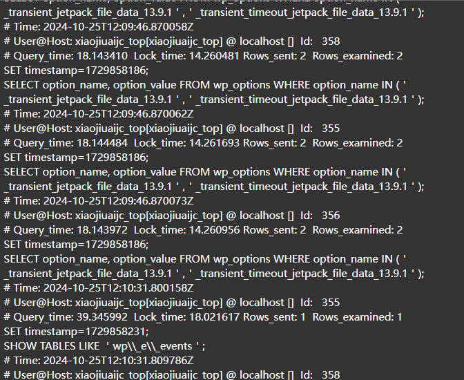 如何定位慢查询 xiaojiuaigc@163.com 发布于 2024-11-03 397 次阅读 方案1:使用开源的工具skyworking等工具Skywalking:我们当时做压测的时候有的接口非常的慢,接口的响应时间超过了2秒以上,因为我们当时的系统部署了运维的监控系统Skywaking,在展示的报表中可以看到是哪一个接口比较慢,并且可以分析这个接口哪部分比较慢,这里可以看到SQL的具体的执行时间,所以可以定位是哪个sg!出了问题方案2:使用mysq自带的慢日志慢查询日志记录了所有执行时间超过指定参数(long_query_time,单位:秒,默认10秒)的所有SQL语句的日志如果要开启慢查询日志,需要在MySQL的配置文件(/etc/my.cnf)中配置如下信息: 配置完毕之后,通过以下指令重新启动MySQL服务器进行测试,查看慢日志文件中记录的信息 /var/lib/mysql/localhost-slow.log。 我的网站在最开始做统计访问人数的时候为了方便快捷就使用了一个插件统计Jetpack这是其中的一些日志 可以看到有些查询很慢甚至达到了18秒之所以查询这么慢是因为表锁竞争:多个查询同时访问同一个表,导致锁竞争。索引缺失或不优化:wp_options表上的索引可能不够优化,导致查询效率低下。高并发:系统在高并发情况下,可能会出现资源争用,导致查询变慢。表碎片:表中的数据碎片可能导致查询性能下降这还导致服务器负载cpu使用率飙增我数据库挂了三次所以后面统计访问次数就自己搞了