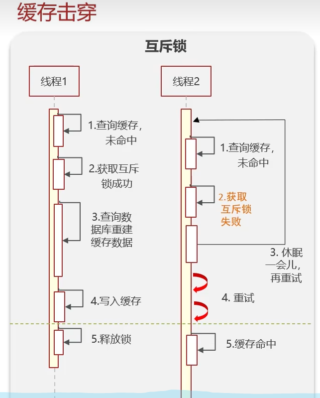 缓存穿透、击穿、雪崩 xiaojiuaigc@163.com 发布于 2024-10-31 350 次阅读 缓存穿透 缓存穿透:查询一个不存在的数据,mysql查询不到数据也不会直接写入缓存,就会导致每次请求都查数据库 解决方案:解决方案(一)缓存空数据,查询的数据为空,吧这个空结果放到缓存里面去优点:简单缺点:消耗内存可能会发生数据不一致的问题解决方案(二)布隆过滤器:用于检索一个元素是否在一个集合中 这是测试文本,单击 “编辑” 按钮更改此文本。 缓存击穿 缓存击穿:给某一个key设置了过期时间,当key过期的时候,恰好这时间点对这个key有大量的并发请求过来,这些并发的请求可能会瞬间把DB压垮 解决方案1互斥锁(性能较差,需要强一致性时使用) 解决方案2:逻辑过期(性能较优,高可用) 缓存雪崩 缓存雪崩是指在同一时间段有大量的缓存key同时失效或者Redis服务宕机,导致大量的请求到达数据库,带来巨大压力 解决方案:给不同的Key的TTL添加随机值利用Redis集群提高服务的可用性(哨兵、集群模式)给缓存业务添加降级限流策略(nginx/spring cloud gateway)(可以作为系统的保底解决策略适用于穿透、击穿、雪崩)给业务添加多级缓存(Guava或者Caffein) 助记诗:《缓存三兄弟》穿透无中生有key,布隆过滤null隔离。缓存击穿过期key,锁与非期解难题。雪崩大量过期key,过期时间要随机。面试必考三兄弟,可用限流来保底。